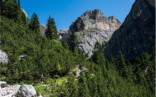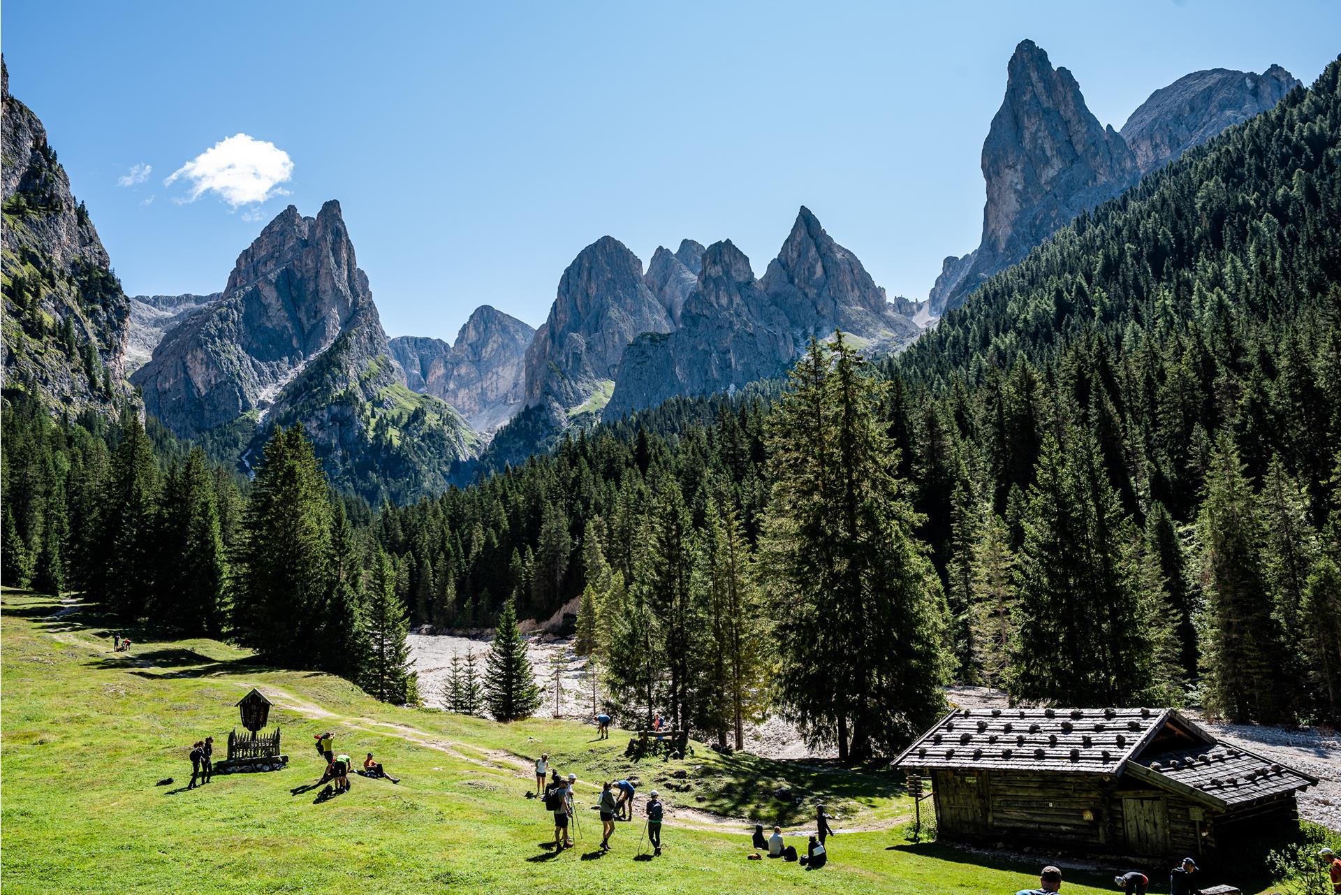 Today, as then, the mountaineering village holds great appeal for sports enthusiasts and nature lovers, who also enjoy excellent hospitality. In Tiers, numerous events take place every year under the synonym "Die Bergler." The focus is especially on the culinary aspect, in combination with the fascinating mountain world of the Rosengarten. It is about reinterpreting old recipes and products, creating unforgettable culinary moments in the heart of the World Natural Heritage site. For example, in July, you can participate in the legendary "Bergler Tafel" on the Proa, an alpine meadow above Weißlahnbad. With up to 200 people, you can admire the wonderful view while enjoying a 5-course open-air menu with selected wines. In June, you can take part in the "Bergler Harass" below the Tschafon walls, directly at Wuhnleger, on a picnic blanket with a view of the Rosengarten and Latemar, tasting local products such as Speck, cheese, butter, Kaminwurzen, wine, apple juice, and Krapfen - all from the region.